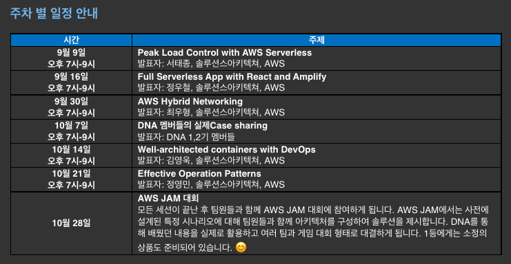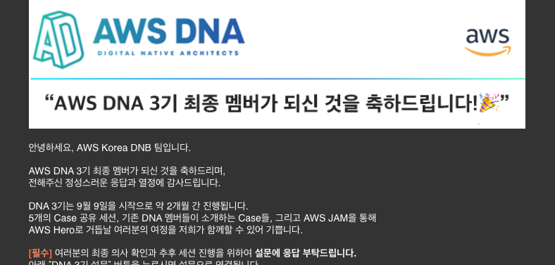 제게 AWS DNA는 커뮤니티에서 1기, 2기 멤버분들의 후기들을 접하고 ‘진짜 재밌겠다..!’ 라고 생각하고 막연하게 존재만 알고 있던 프로그램이였습니다. 3기를 모집한다면 한번 도전해봐야겠다는 생각만 하고 지내고 있었는데, 8월 월간 미팅이 끝날때 AWS Account Manager님께서 DNA 3기 모집 안내를 해주셨습니다.