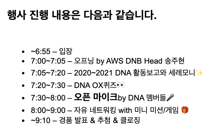 처음에는 AWS DNB팀에서 DNA 프로그램 1기부터 3기에 이르기까지의 역사(?)에 대해 소개해주셨고, 앞으로 더욱 즐거운 커뮤니티로 함께하자는 이야기를 해주셨어요.