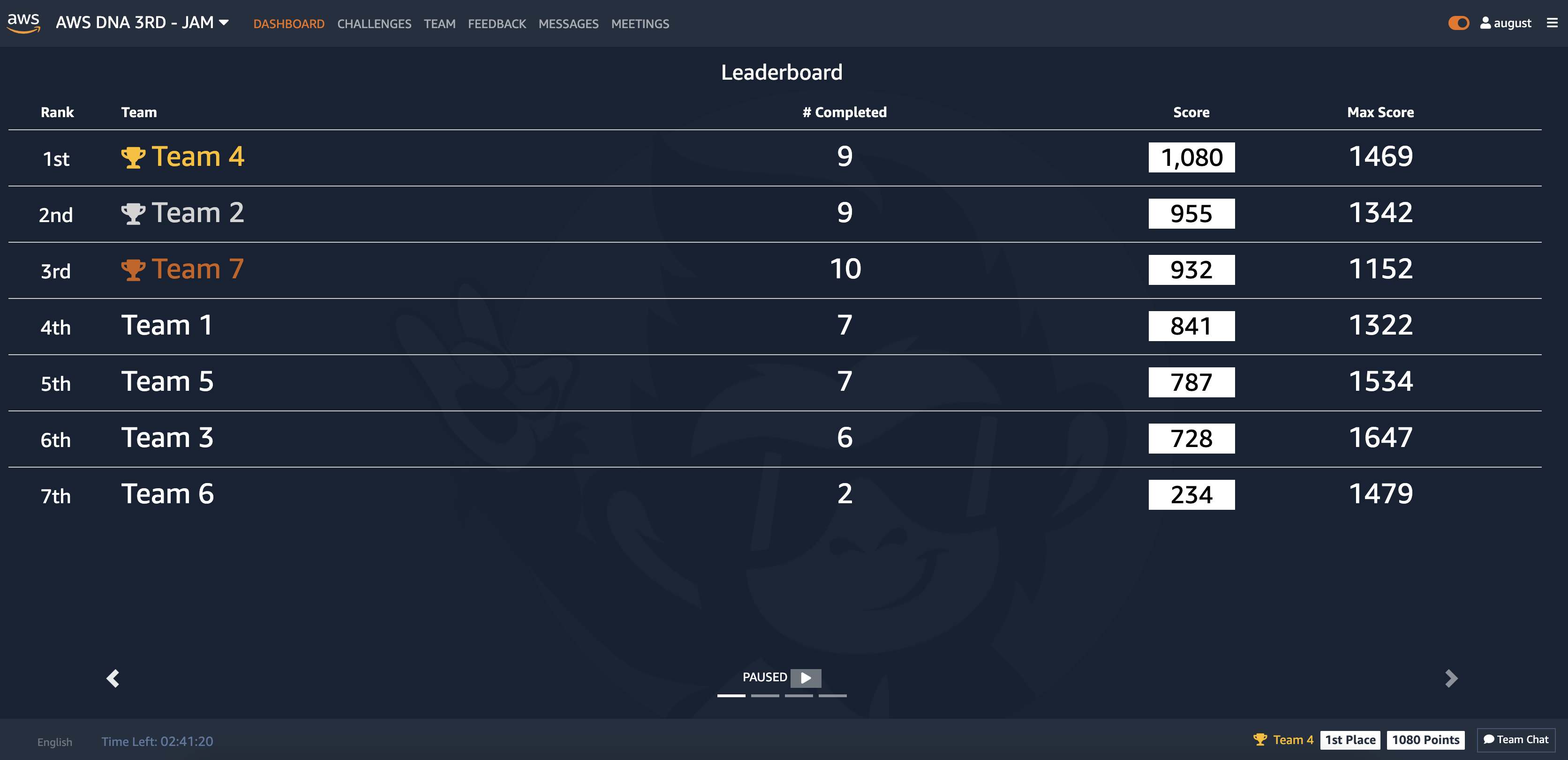 뭔가 고장난듯한(?) 다양한 상황(ex. vpc에서 public internet이 안되는 상황)이 주어지고 해당 상황을 주어진 요구사항에 맞게 동작하도록 고치거나 해결할 때마다 점수를 얻게 됩니다. 주어진 시간동안 해결한 문제들에 대해 팀 별로 얻은 점수를 합산해 최종적으로 순위를 산출하게 됩니다. 제가 속한 4팀이 1등을 해서 상품을 받게 되어 기뻤습니다. (나중에 프로그램이 다 끝나고도 팀원분들과 식사하면서 AWS JAM 당시 상황에 대해 재미있게 이야기를 나눴던 기억이 있습니다.)